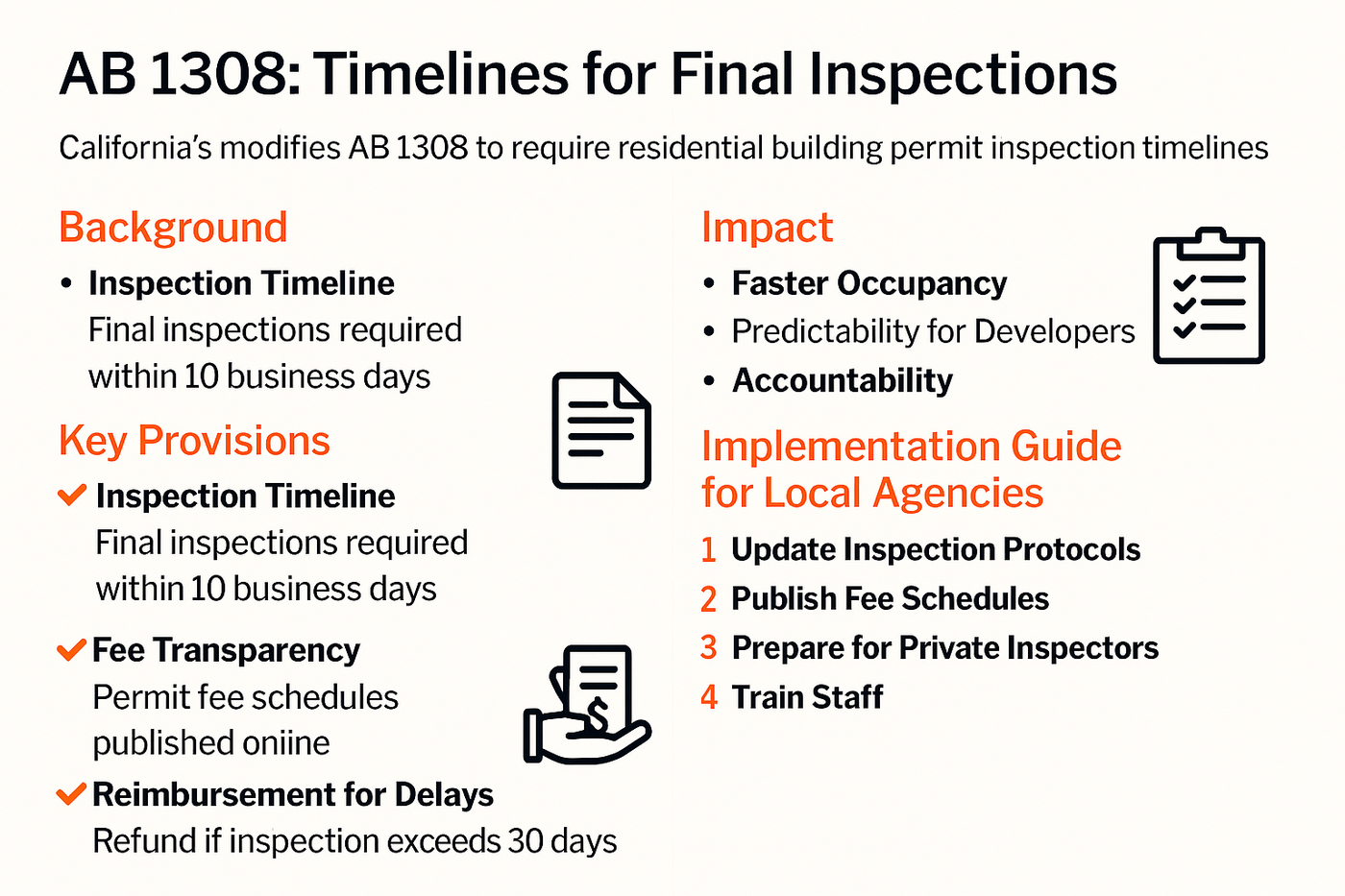 These delays disproportionately affect small-scale projects—such as duplexes or 10-unit infill developments—where carrying costs and financing terms are tight. AB 1308 introduces a “shot clock” for inspections to speed up housing production.