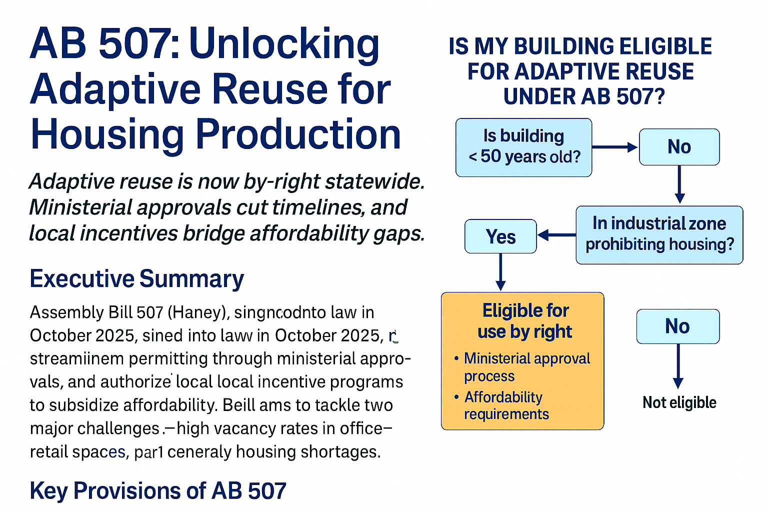 California’s Assembly Bill 507 (Haney), signed into Law in October 2025, is a cornerstone of the state’s housing strategy to convert underutilized commercial buildings into housing. The bill establishes adaptive reuse as a “use by right” statewide, streamlines permitting through ministerial approvals, and authorizes local incentive programs to subsidize affordability. It aims to tackle two significant challenges: high vacancy rates in office/retail spaces and severe housing shortages, particularly in urban areas.