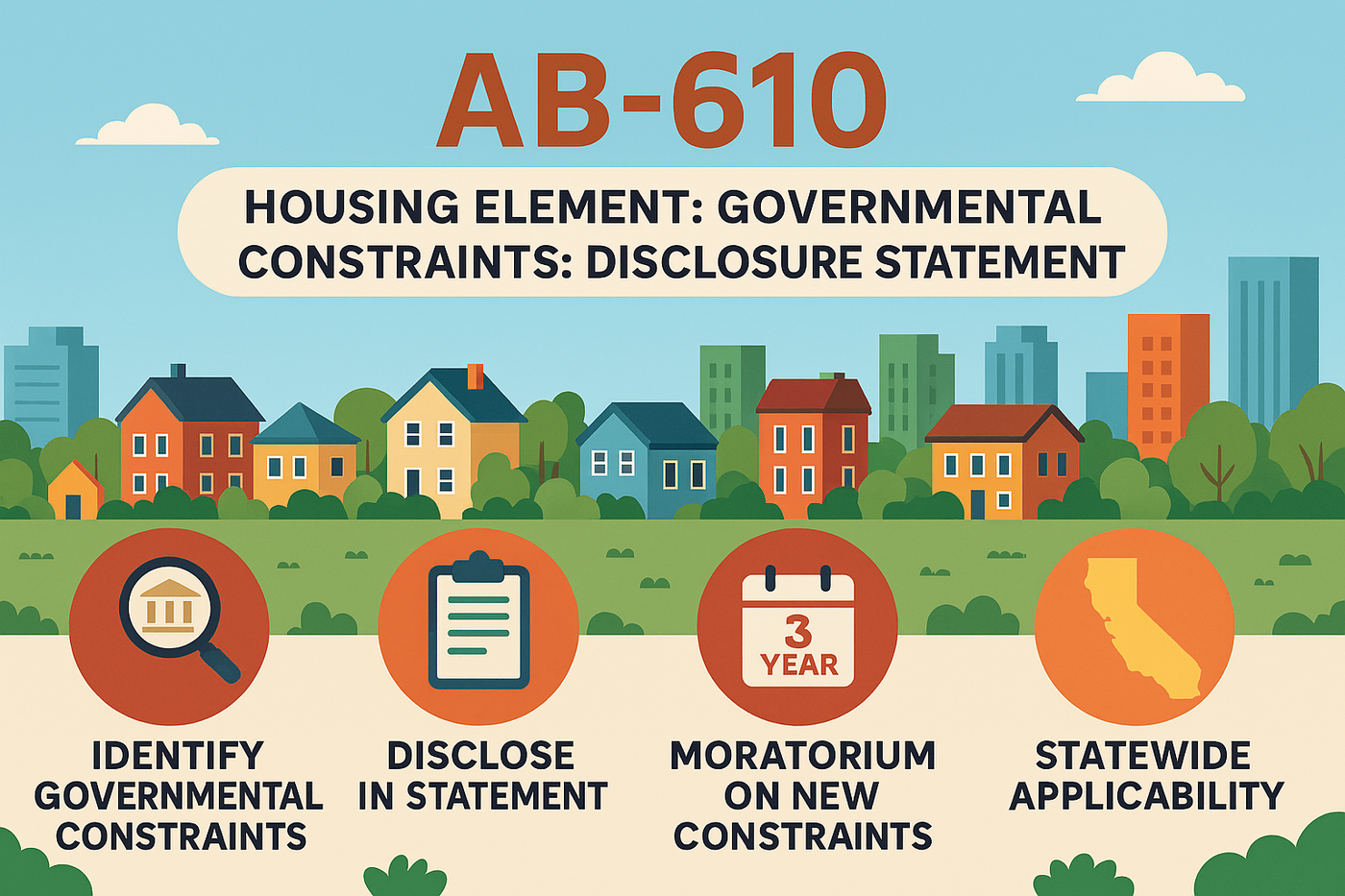 AB-610 strengthens the Housing Element Law by requiring the inclusion of a Governmental Constraints Disclosure Statement in every housing element revision (starting with the 7th cycle and beyond). This statement must: