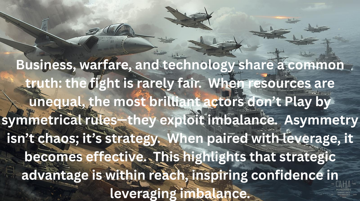 Business, warfare, and technology share a common truth: the fight is rarely fair. When resources are unequal, the most brilliant actors don’t Play by symmetrical rules—they exploit imbalance. Asymmetry isn’t chaos; it’s strategy. When paired with leverage, it becomes effective. This highlights that strategic advantage is within reach, inspiring confidence in leveraging imbalance.