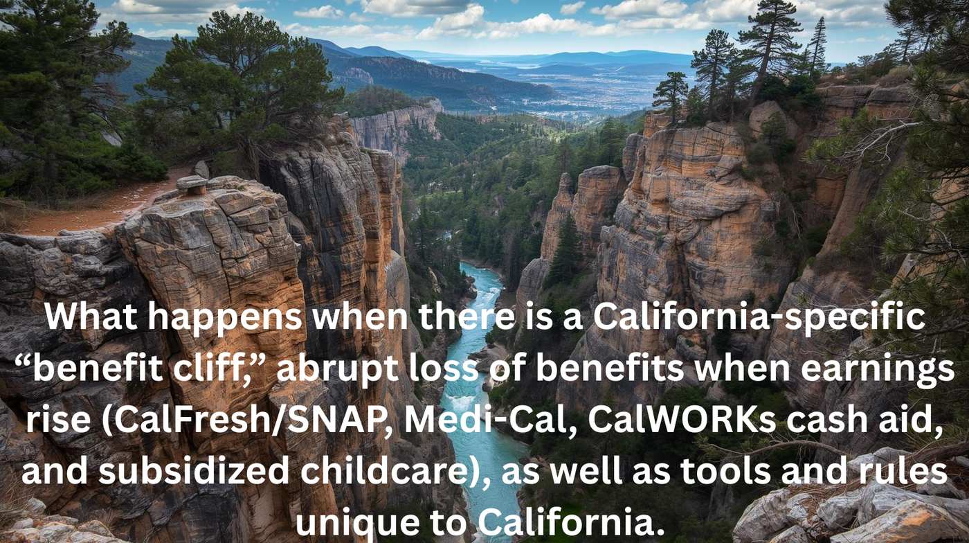What happens when there is a California-specific “benefit cliff,” abrupt loss of benefits when earnings rise (CalFresh/SNAP, Medi-Cal, CalWORKs cash aid, and subsidized childcare), as well as tools and rules unique to California. California Benefit Cliffs: What to Watch and Where They Hit