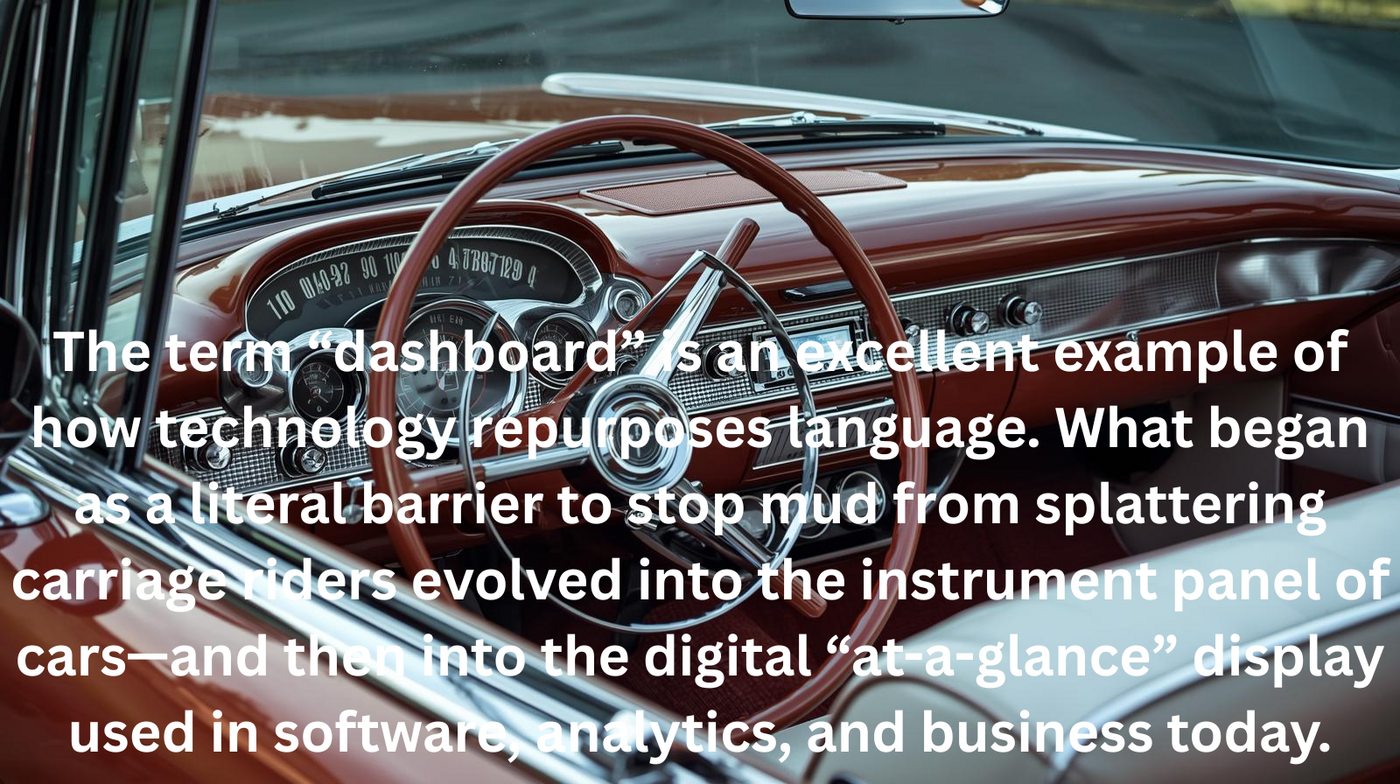 The term “dashboard” is an excellent example of how technology repurposes language. What began as a literal barrier to stop mud from splattering carriage riders evolved into the instrument panel of cars—and then into the digital “at-a-glance” display used in software, analytics, and business today.