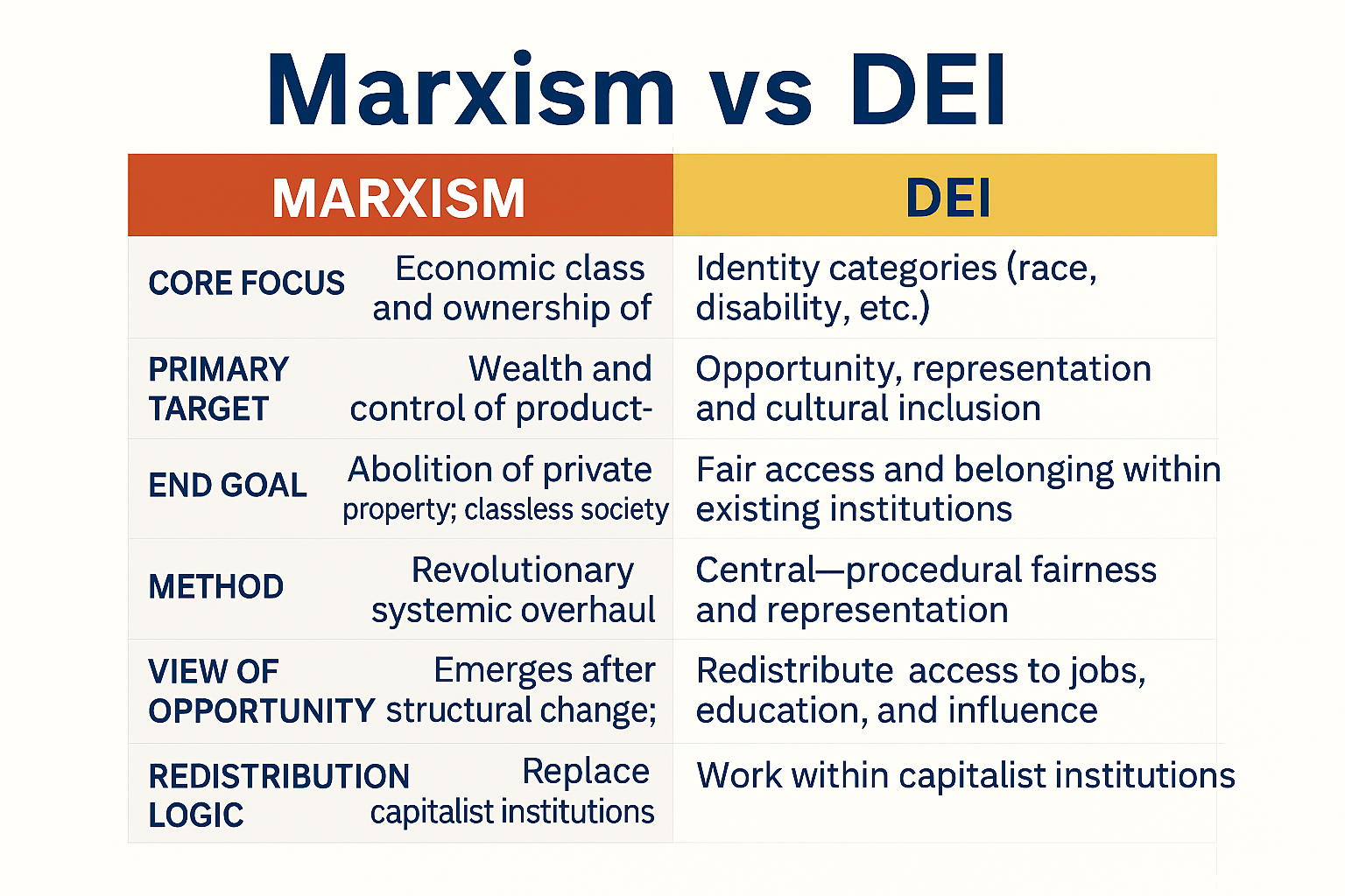 - Critique of Power Structures: Both DEI (Diversity, Equity, Inclusion) and Marxism challenge existing hierarchies—DEI focuses on race, gender, and identity, while Marxism focuses on class and economic power.