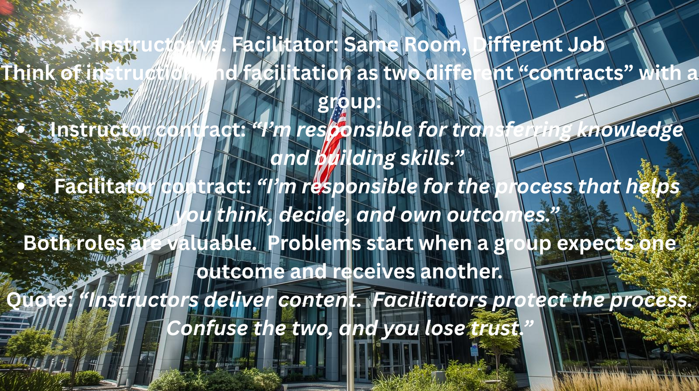 Quote: “Instructors deliver content. Facilitators protect the process. Confuse the two, and you lose trust.”