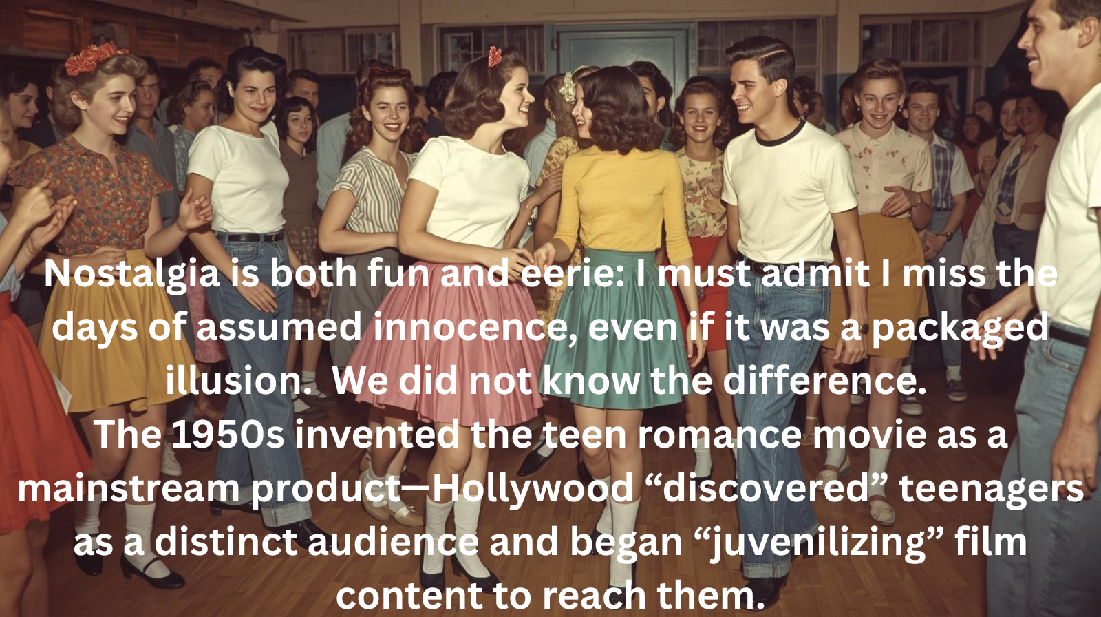 Nostalgia is both fun and eerie: I must admit I miss the days of assumed innocence, even if it was a packaged illusion. We did not know the difference. The 1950s invented the teen romance movie as a mainstream product—Hollywood “discovered” teenagers as a distinct audience and began “juvenilizing” film content to reach them.