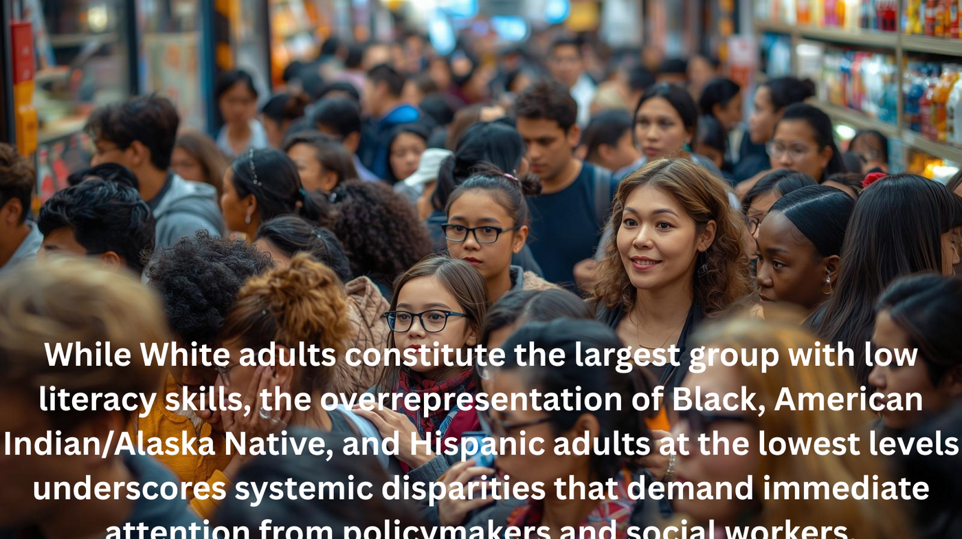 While White adults constitute the largest group with low literacy skills, the overrepresentation of Black, American Indian/Alaska Native, and Hispanic adults at the lowest levels underscores systemic disparities that demand immediate attention from policymakers and social workers.