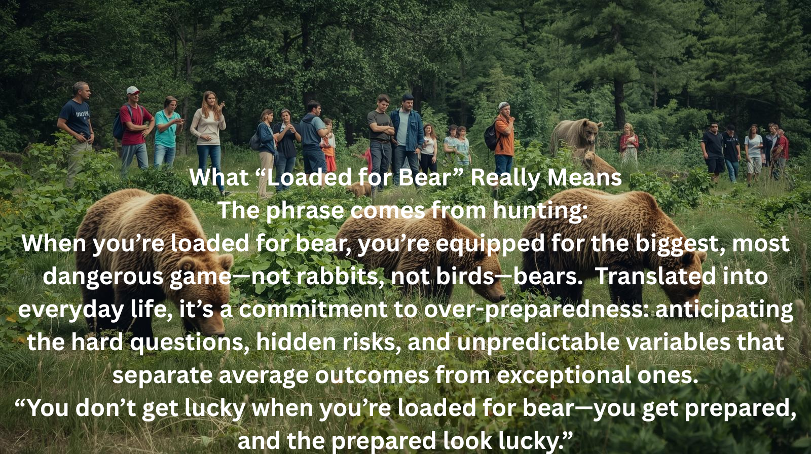 When you’re loaded for bear, you’re equipped for the biggest, most dangerous game—not rabbits, not birds—bears. Translated into everyday life, it’s a commitment to over-preparedness: anticipating the hard questions, hidden risks, and unpredictable variables that separate average outcomes from exceptional ones.