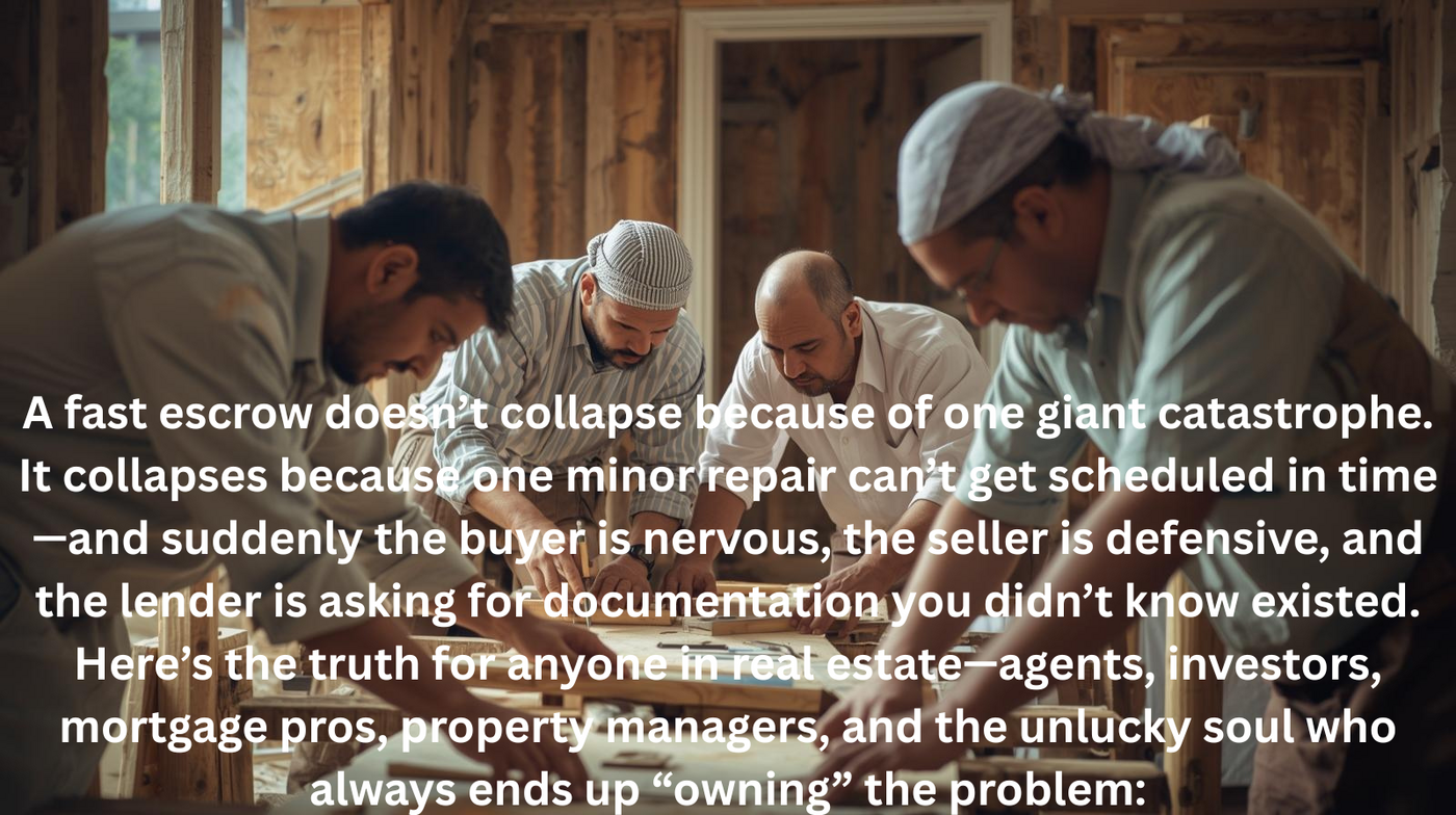 A fast escrow doesn’t collapse because of one giant catastrophe. It collapses because one minor repair can’t get scheduled in time—and suddenly the buyer is nervous, the seller is defensive, and the lender is asking for documentation you didn’t know existed.