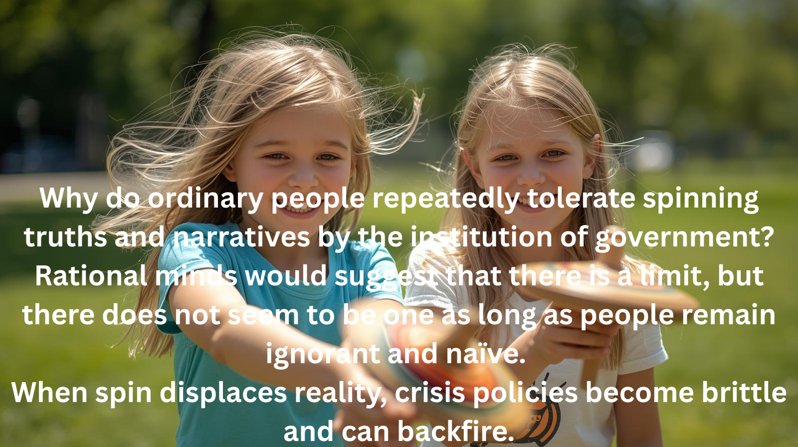 Why do ordinary people repeatedly tolerate spinning truths and narratives by the institution of government? Rational minds would suggest that there is a limit, but there does not seem to be one as long as people remain ignorant and naïve. When spin displaces reality, crisis policies become brittle and can backfire.