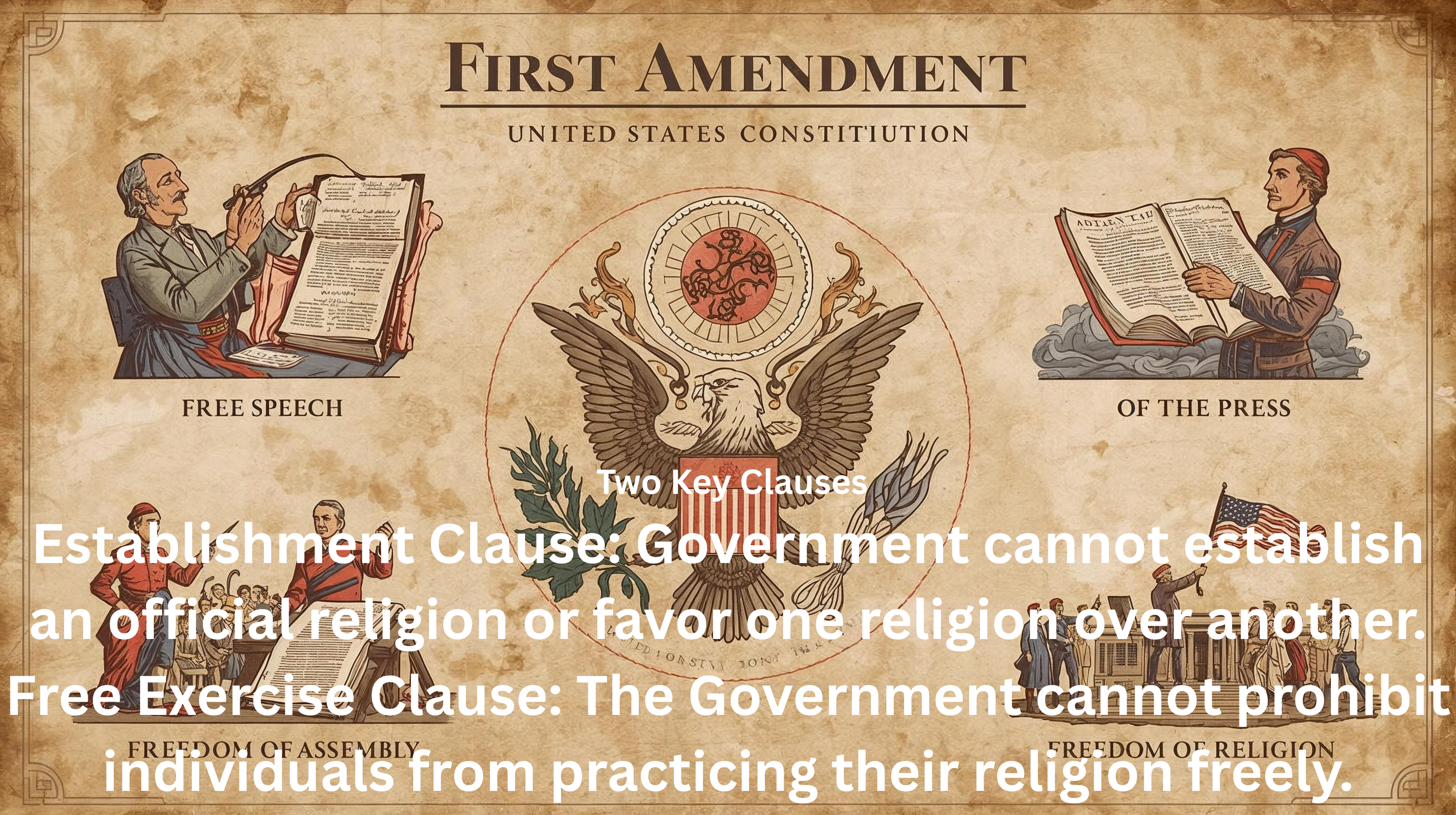 Free Exercise Clause: The Government cannot prohibit individuals from practicing their religion freely.