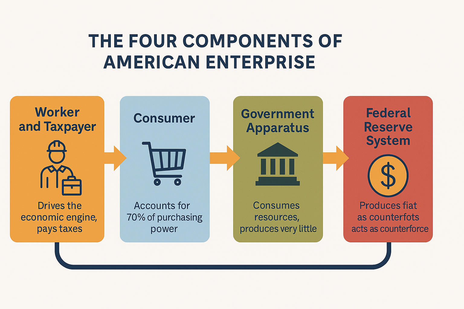 The administrative state, agencies, and nonprofits provide public goods but primarily consume resources. Social Security, Medicare, defense, and interest dominate federal spending. Regulation adds another layer: while rules deliver social benefits, compliance costs and delays act as a hidden tax on growth, increasing the cost of doing business and potentially reducing investment and innovation.