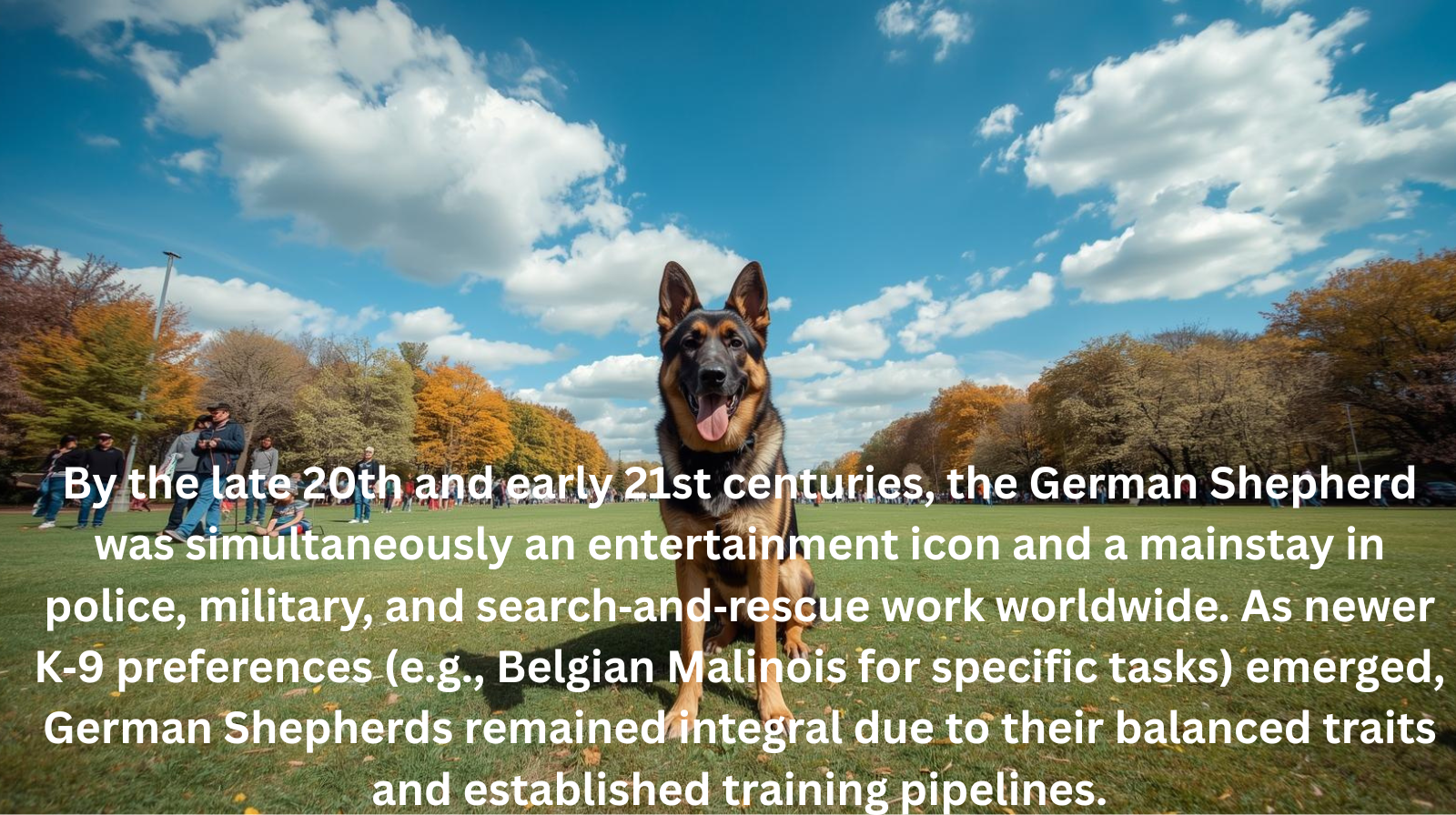 By the late 20th and early 21st centuries, the German Shepherd was simultaneously an entertainment icon and a mainstay in police, military, and search‑and‑rescue work worldwide. As newer K‑9 preferences (e.g., Belgian Malinois for specific tasks) emerged, German Shepherds remained integral due to their balanced traits and established training pipelines.