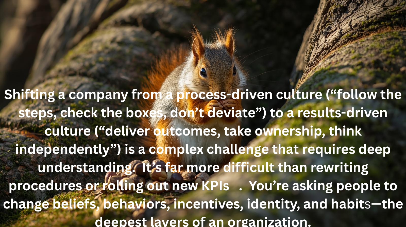 “Turning a process-driven organization into a results-driven one is a tough nut to crack because it requires changing mindsets, incentives, leadership behaviors, and the stories people believe—not just rewriting a manual.”