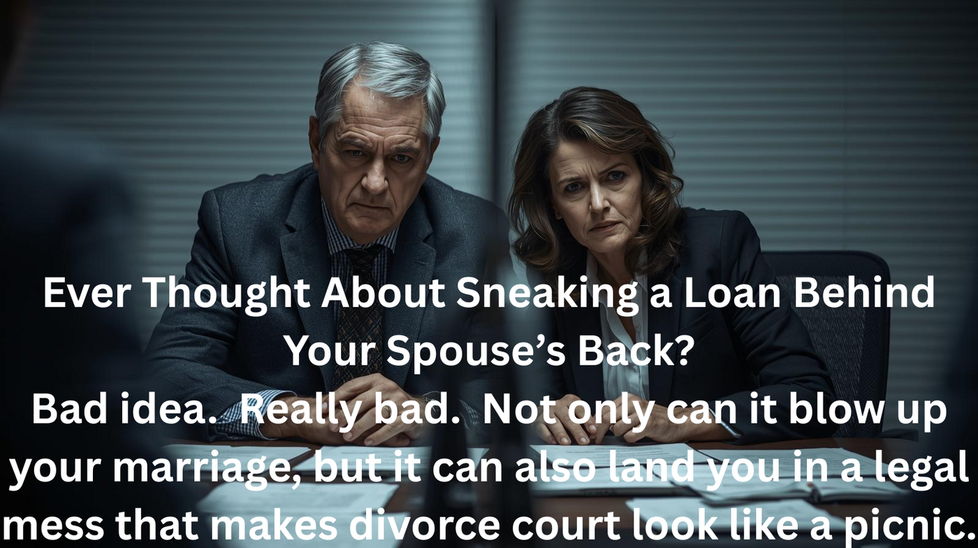 Before you decide to Play financial ninja and sneak a loan behind your spouse’s back, remember this: California Law isn’t impressed by stealth. Courts will void that deal faster than your spouse can say, “We need to talk.” The cost of secrecy? Your home, your business dream, and maybe half your assets. The cost of transparency? Absolutely nothing. Protect your property, your relationship, and your sanity—because trust is always cheaper than litigation.