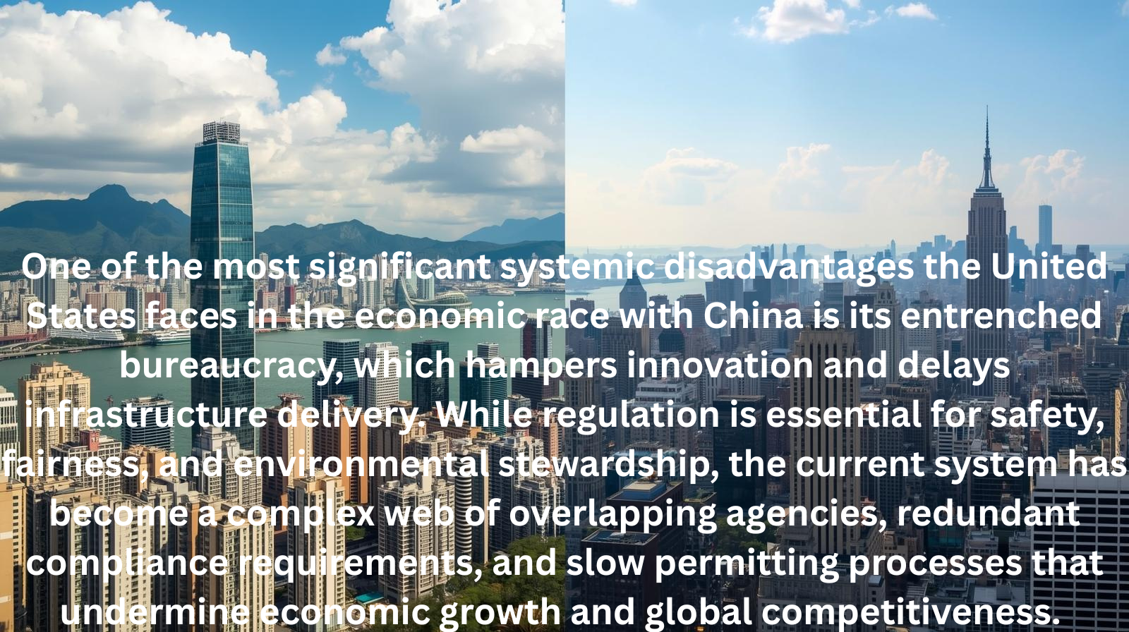 One of the most significant systemic disadvantages the United States faces in the economic race with China is its entrenched bureaucracy, which hampers innovation and delays infrastructure delivery.  While regulation is essential for safety, fairness, and environmental stewardship, the current system has become a complex web of overlapping agencies, redundant compliance requirements, and slow permitting processes that undermine economic growth and global competitiveness.  Addressing these issues can restore confidence in U.S. economic leadership and inspire policymakers to pursue meaningful reforms.