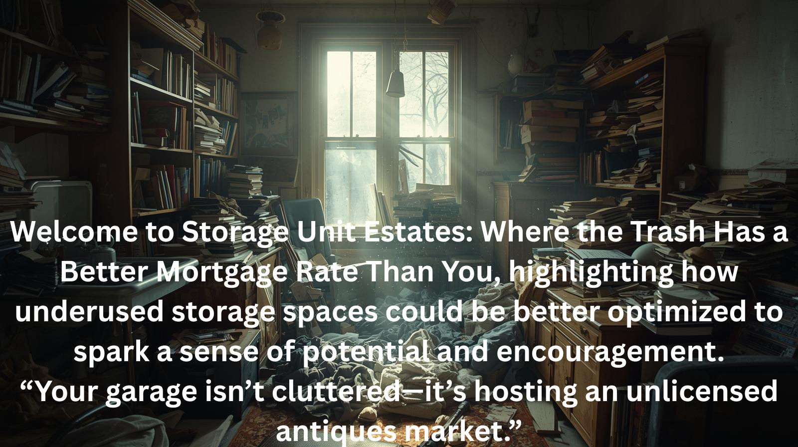 Welcome to Storage Unit Estates: Where the Trash Has a Better Mortgage Rate Than You, highlighting how underused storage spaces could be better optimized to spark a sense of potential and encouragement.