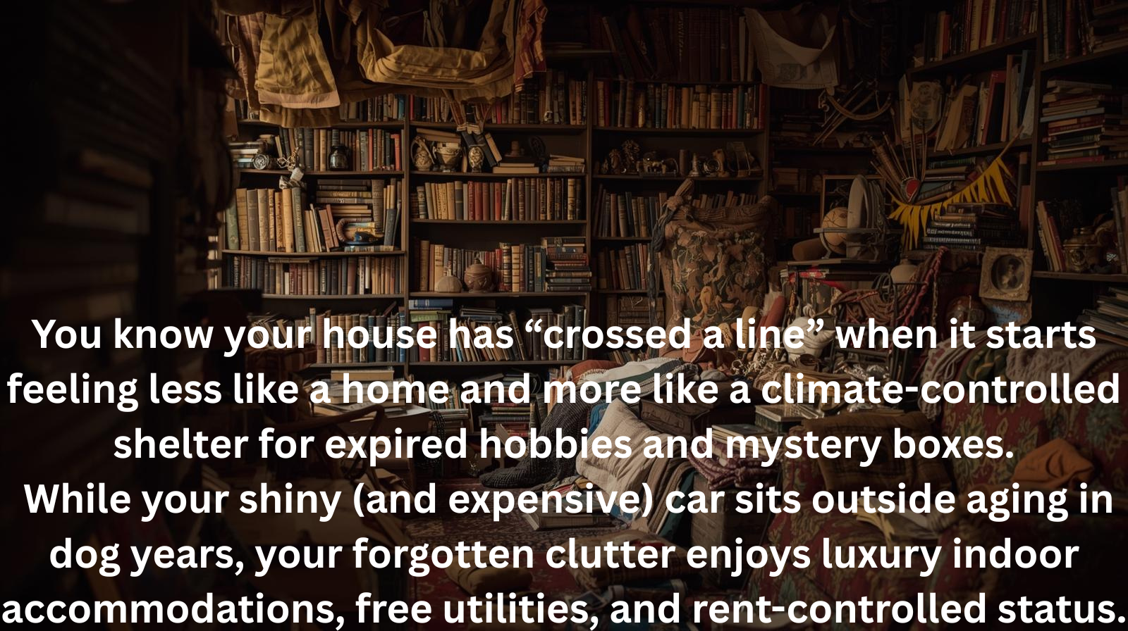 When Did Your Home Become a Paid-For Storage Unit of things that you haven’t touched in 10 to 20 years? You know your house has “crossed a line” when it starts feeling less like a home and more like a climate-controlled shelter for expired hobbies and mystery boxes. While your shiny (and expensive) car sits outside aging in dog years, your forgotten clutter enjoys luxury indoor accommodations, free utilities, and rent-controlled status.