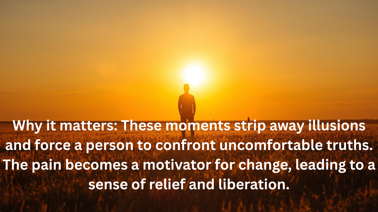 - Why it matters: These moments strip away illusions and force a person to confront uncomfortable truths. The pain becomes a motivator for change, leading to a sense of relief and liberation.
