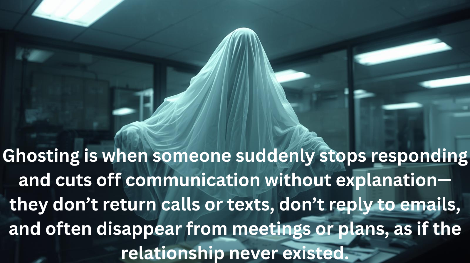 Ghosting is when someone suddenly stops responding and cuts off communication without explanation—they don’t return calls or texts, don’t reply to emails, and often disappear from meetings or plans, as if the relationship never existed.