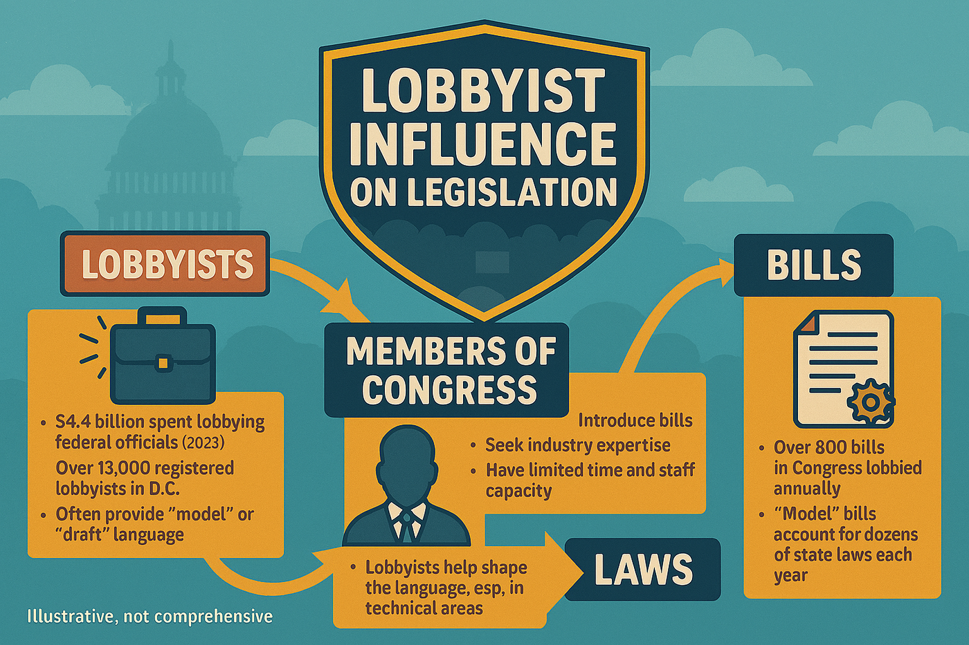 - Direct Drafting: It is common for lobbyists to draft entire bills or major sections, especially in technical areas such as finance, energy, and healthcare.